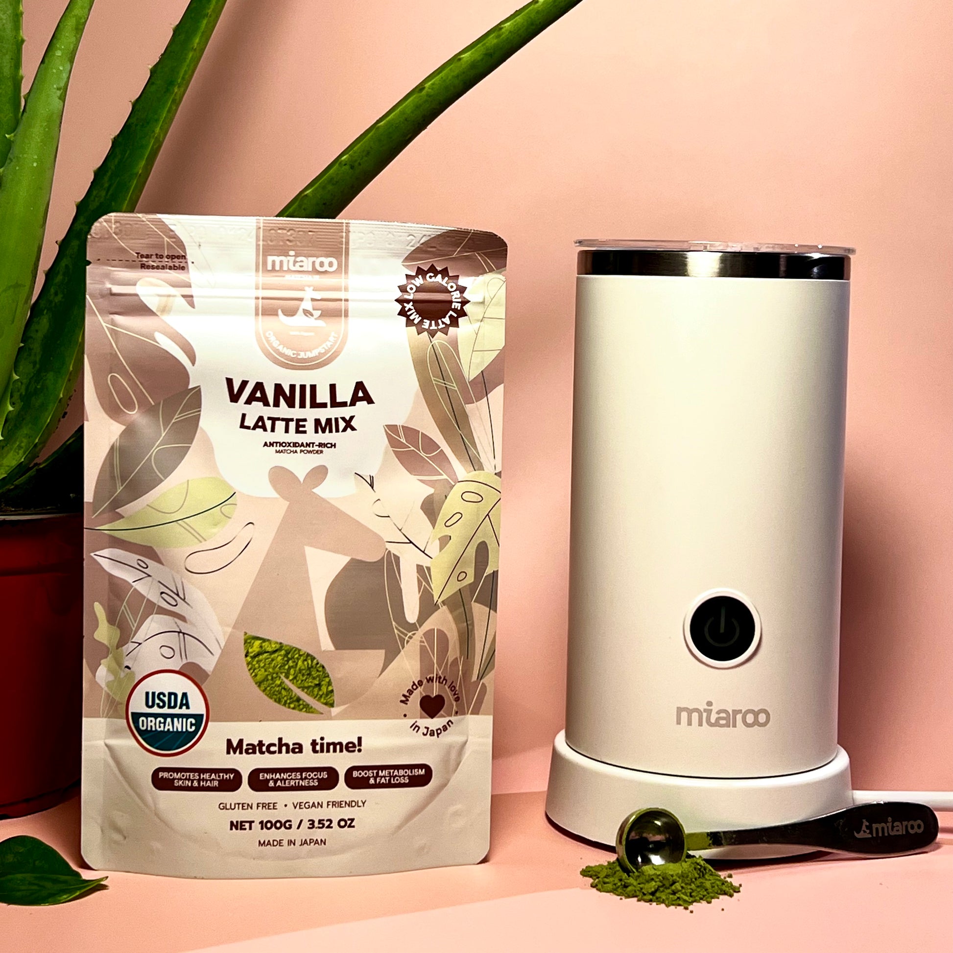Gone are the days of time-consuming matcha prep. Our Miaroo Frother is your ultimate time-saver—just add water or milk and a scoop of our premium matcha powder, and enjoy a perfectly frothy tea or latte in seconds.