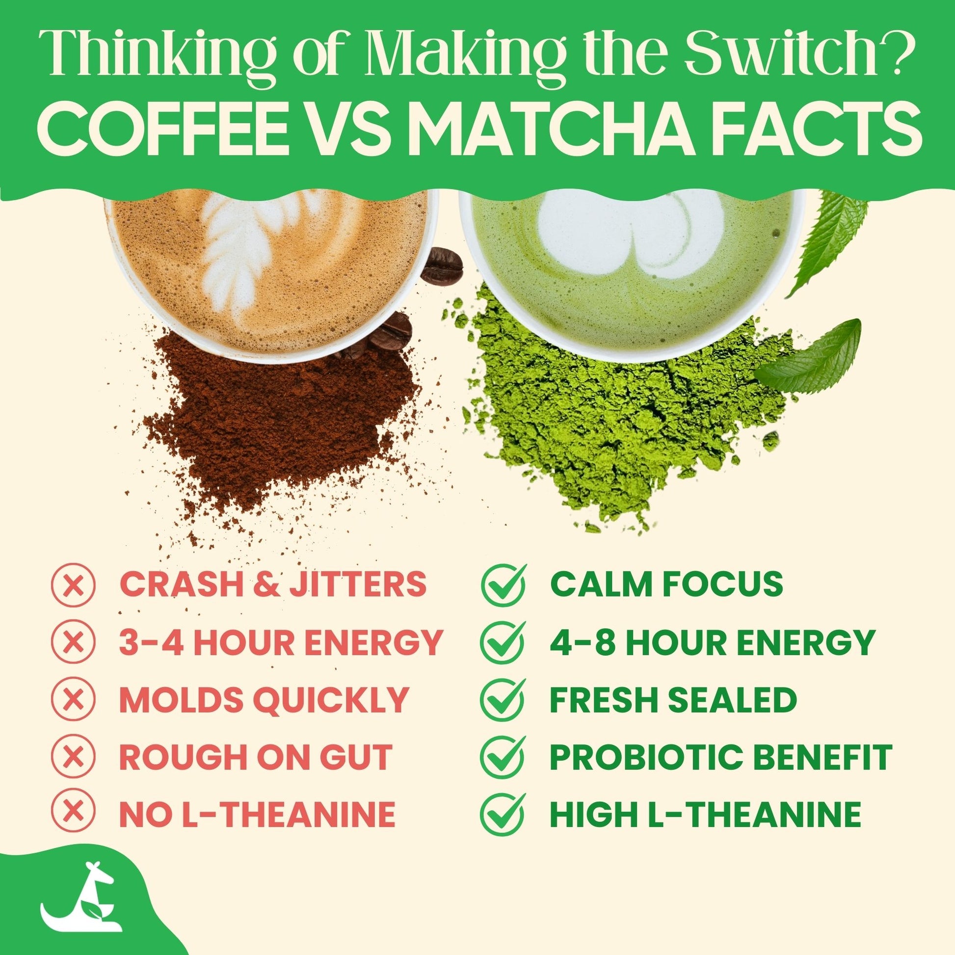 Well, these "waves" are linked to mental relaxation and may help fight stress signals. In addition, matcha provides an extended release of caffeine that gives you sustained, uplifting energy without the jitters or the crash that coffee normally gives you.